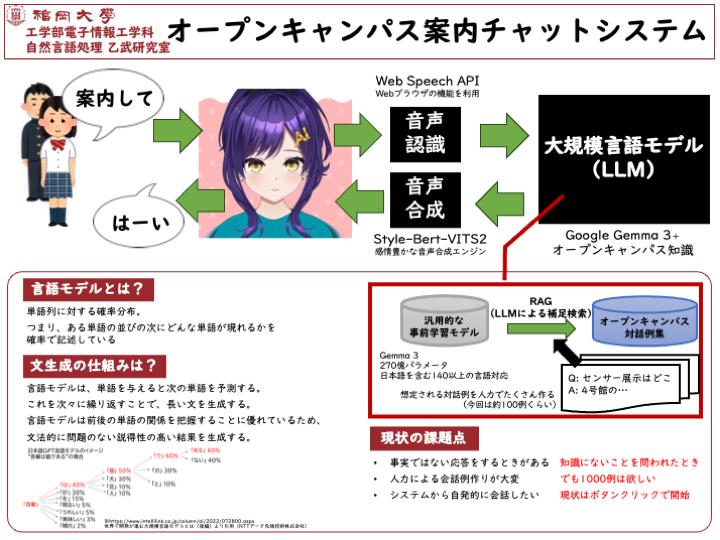 8月2日(土)に開催されたオープンキャンパスにて、当研究室では2つの展示物を披露しました。【オープンキャンパス案内チャットボット】は、電子情報工学科の基礎情報やオープンキャンパスに関する知識を引用することで、来場者の方へ …